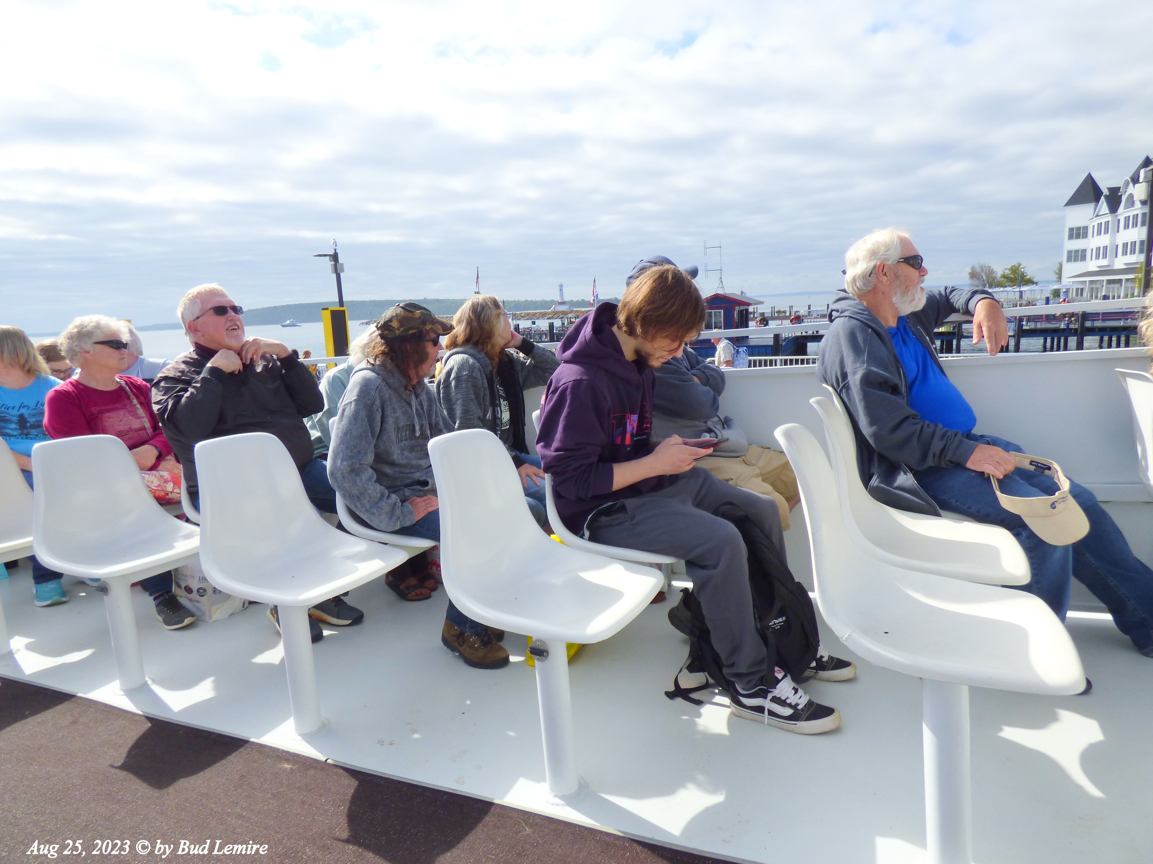 As the Ferry took off, the wind was there, but it felt good. Yes that shadow on that chair in front of me is my hair flying.